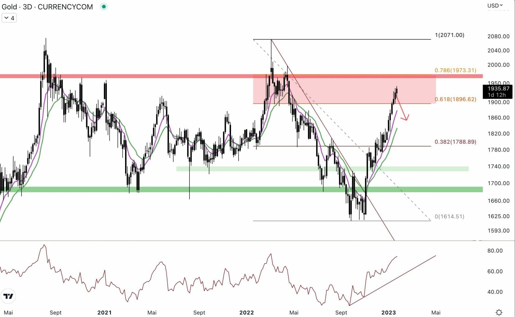 Le cours est en tendance haussière depuis la cassure du niveau à 1 730 $. L’or a fait une déviation en dessous du support à 1 690 $, il est désormais proche de la résistance à 1 970 $. Aussi, le cours est dans la zone de rechargement de shorts (0,618-0,786 de retracement de Fibonacci). Cette zone est propice aux vendeurs, il semble possible que le cours marque une pause. Pour le moment, le cours de l’or reste coincé dans un range entre 1 690 $ et 1 970 $.