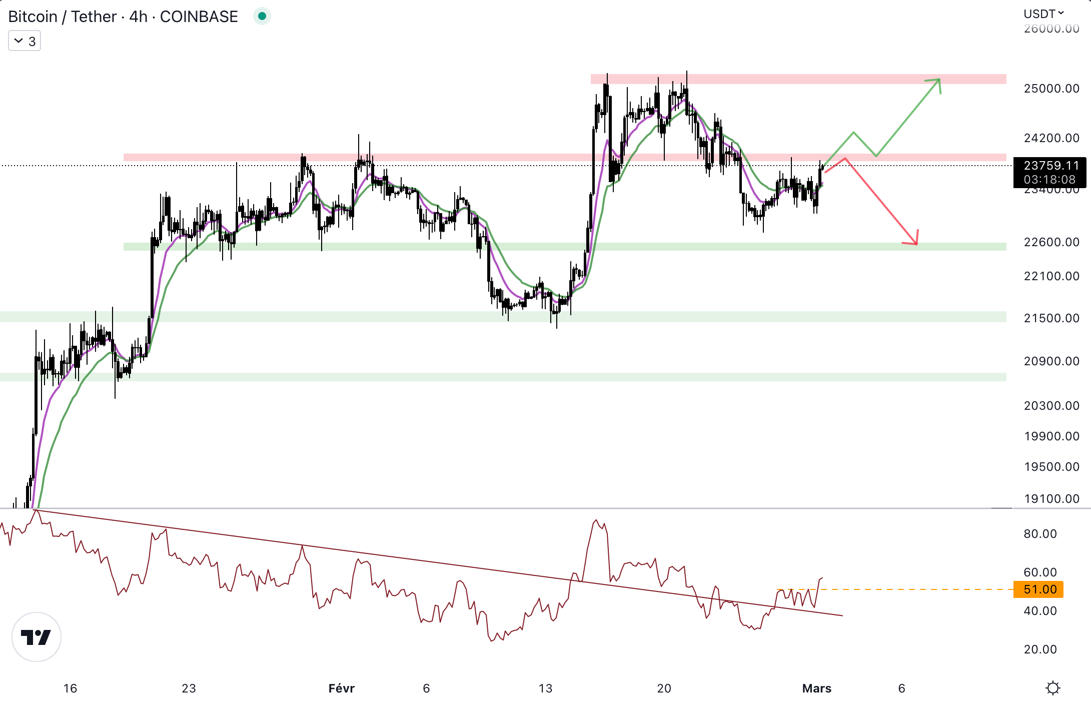 Le cours n’est pas parvenu à se débarrasser de la résistance à 25 000 dollars. Il a alors chuté en dessous de 23 900 dollars. Pour les acheteurs, il faudra reprendre ce niveau pour tenter de casser la résistance à 25 000 dollars. En revanche, en cas de rejet, le cours pourrait revenir au niveau du support identifié en unité de temps 4 h à 22 500 dollars.