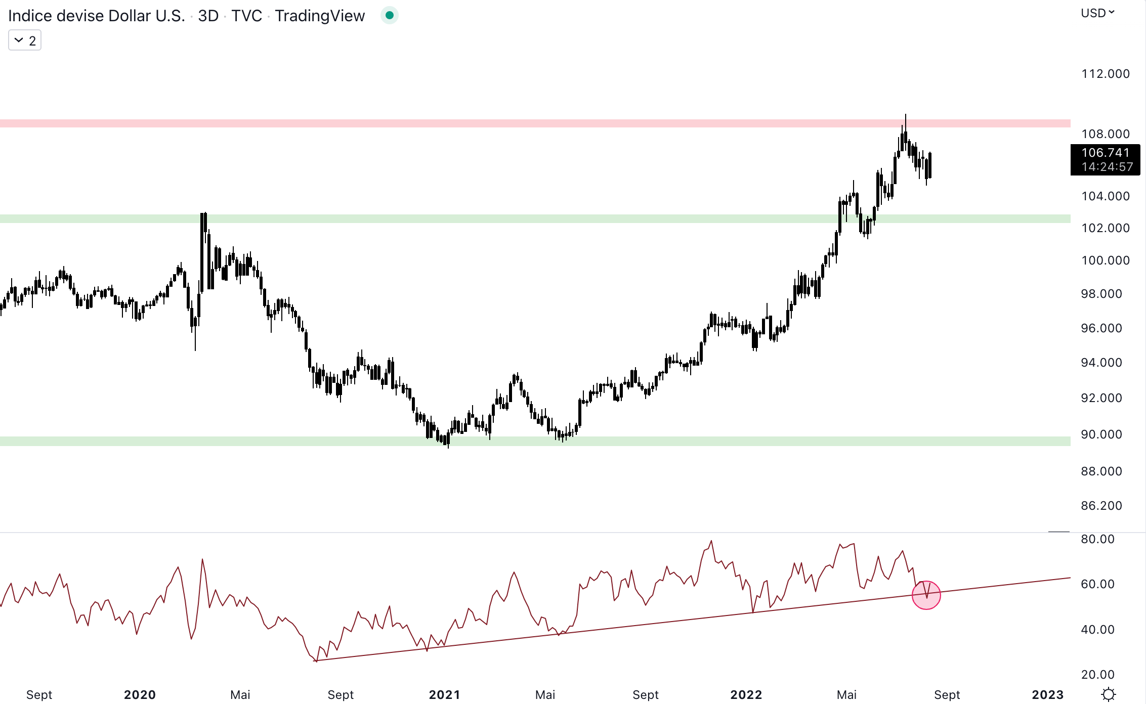 Le dollar index reste en tendance haussière pour le moment. Dans l’unité de temps présenté sur le graphique, il n’y a pas de retournement de tendance pour le moment. Le momentum marque une divergence baissière, mais le RSI reste au-dessus de la trendline haussière. Une divergence signifie un ralentissement au sein d’une tendance, rien n’indique, pour le moment, que la hausse soit terminée.