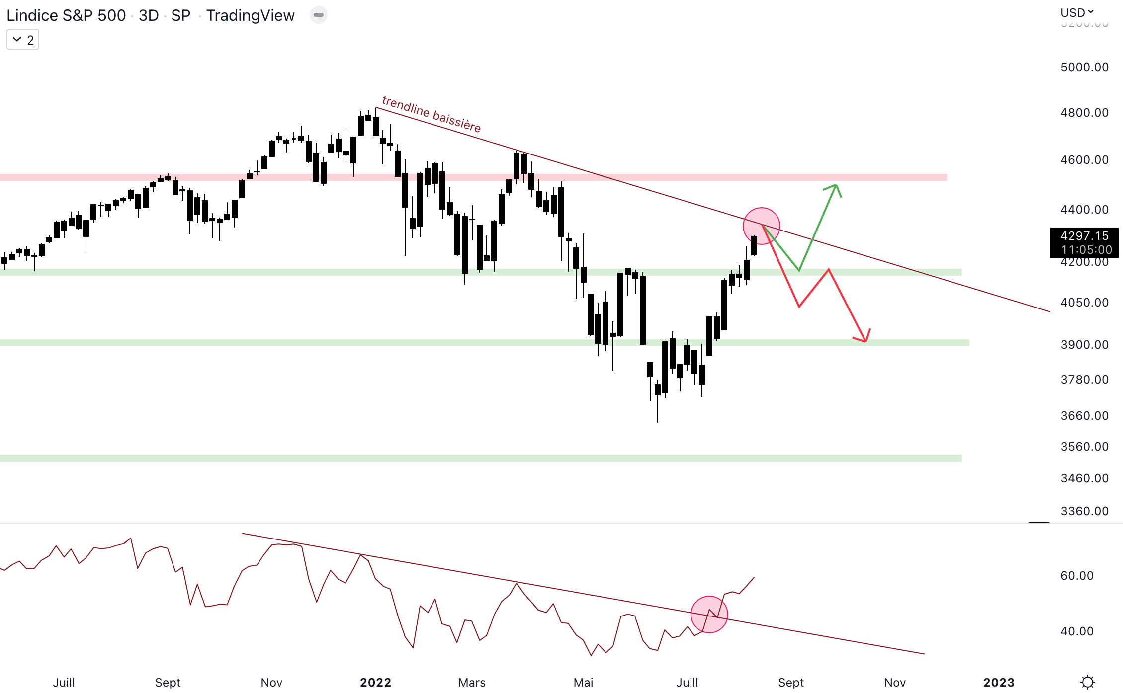 Dans le cas où nous serions dans une correction au sein d’une tendance de fond baissière, le scénario baissier en rouge devrait se mettre en place. La trendline devrait tenir et elle devrait rejeter le cours. De son côté, le momentum montre qu’il est tout à fait possible que la tendance baissière soit terminée. En effet, le RSI évolue au-dessus de la trendline baissière et ceci montre que les acheteurs peuvent reprendre la main sur cet actif.