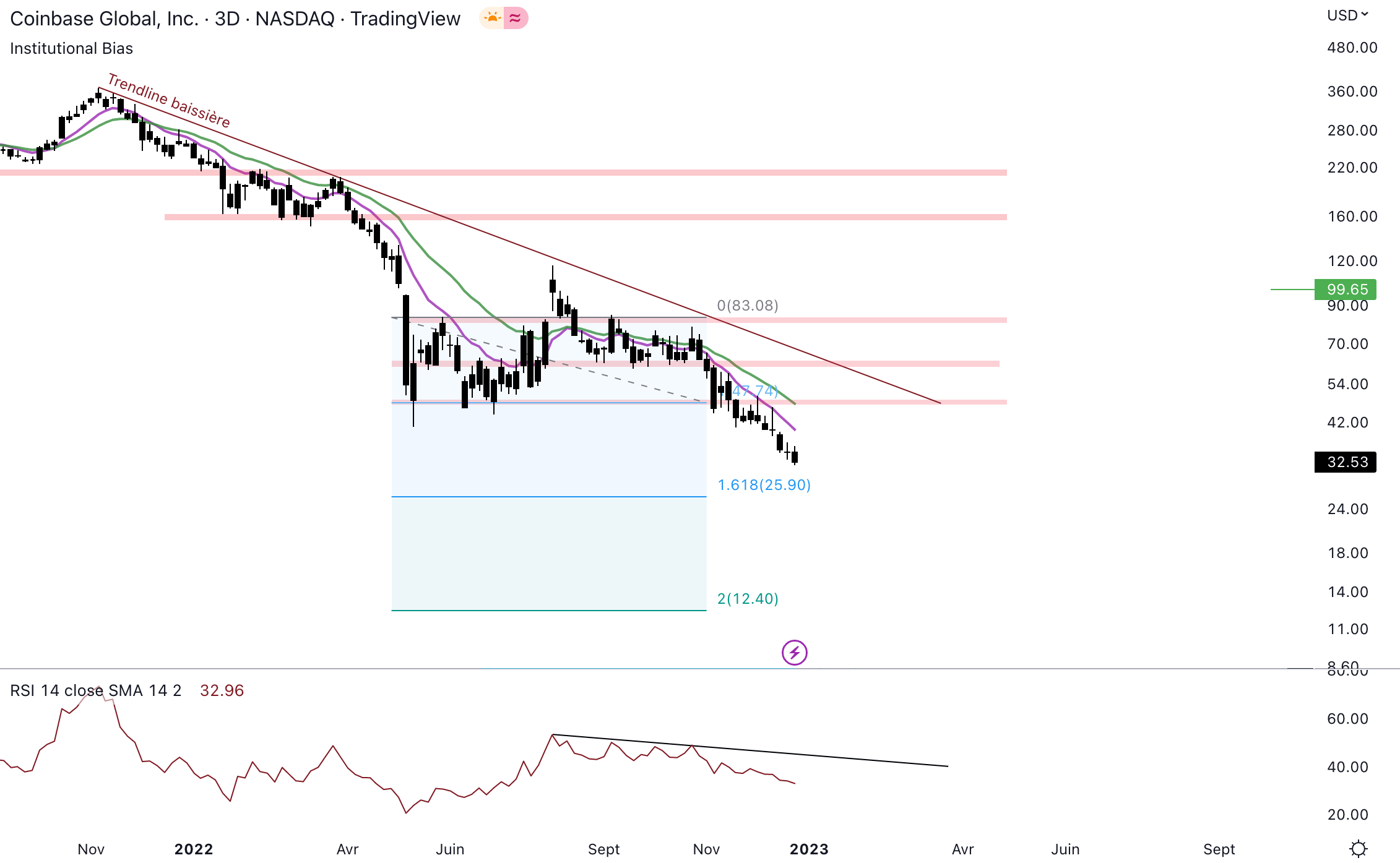 Coinbase n’a jamais été aussi bas dans sa courte histoire, il n’y a donc aucun support matérialisable. Si on considère que le cours était en range entre 80 $ et 48 $, on peut déterminer deux objectifs théoriques grâce aux extensions de Fibonacci. Grâce aux extensions 1.618 et 2, on peut imaginer que le cours se dirige entre 26 $ et 12,4 $. Ce sont des objectifs théoriques, le cours peut aller bien plus bas, mais il est possible que les acheteurs réagissent entre ces deux niveaux.