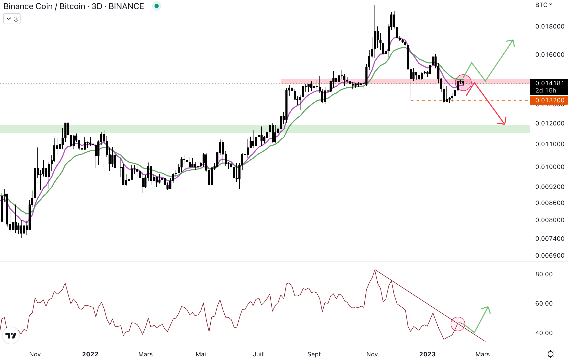 Le cours est au contact de la résistance hebdomadaire et au niveau du biais institutionnel baissier. De plus, le cours a marqué un nouveau plus bas sous 0,0132 BTC, signe de changement de dynamique. De ce fait, le scénario le plus probable est de retrouver la paire BNB/BTC au niveau du prochain support.
