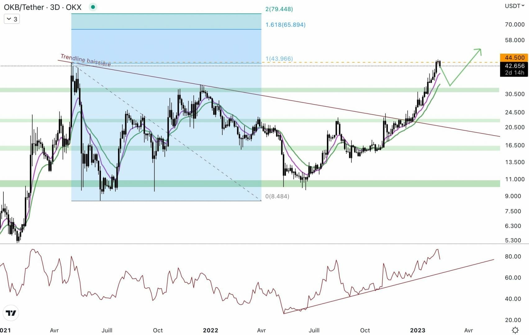 L’objectif théorique, selon l’extension 1.618 et 2 de Fibonacci, se trouve entre 66 $ et 80 $. Attention, l’actif a grimpé de 375 % en ligne droite, il est possible que le cours souffle un peu avant de repartir. Si le Bitcoin ne chute pas, OKB pourrait continuer à s’apprécier.