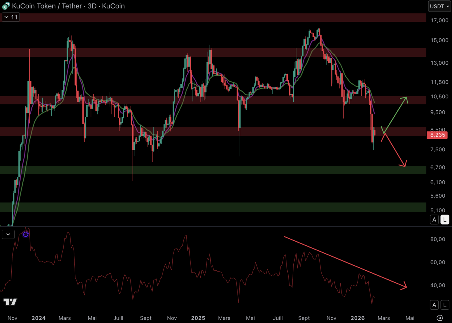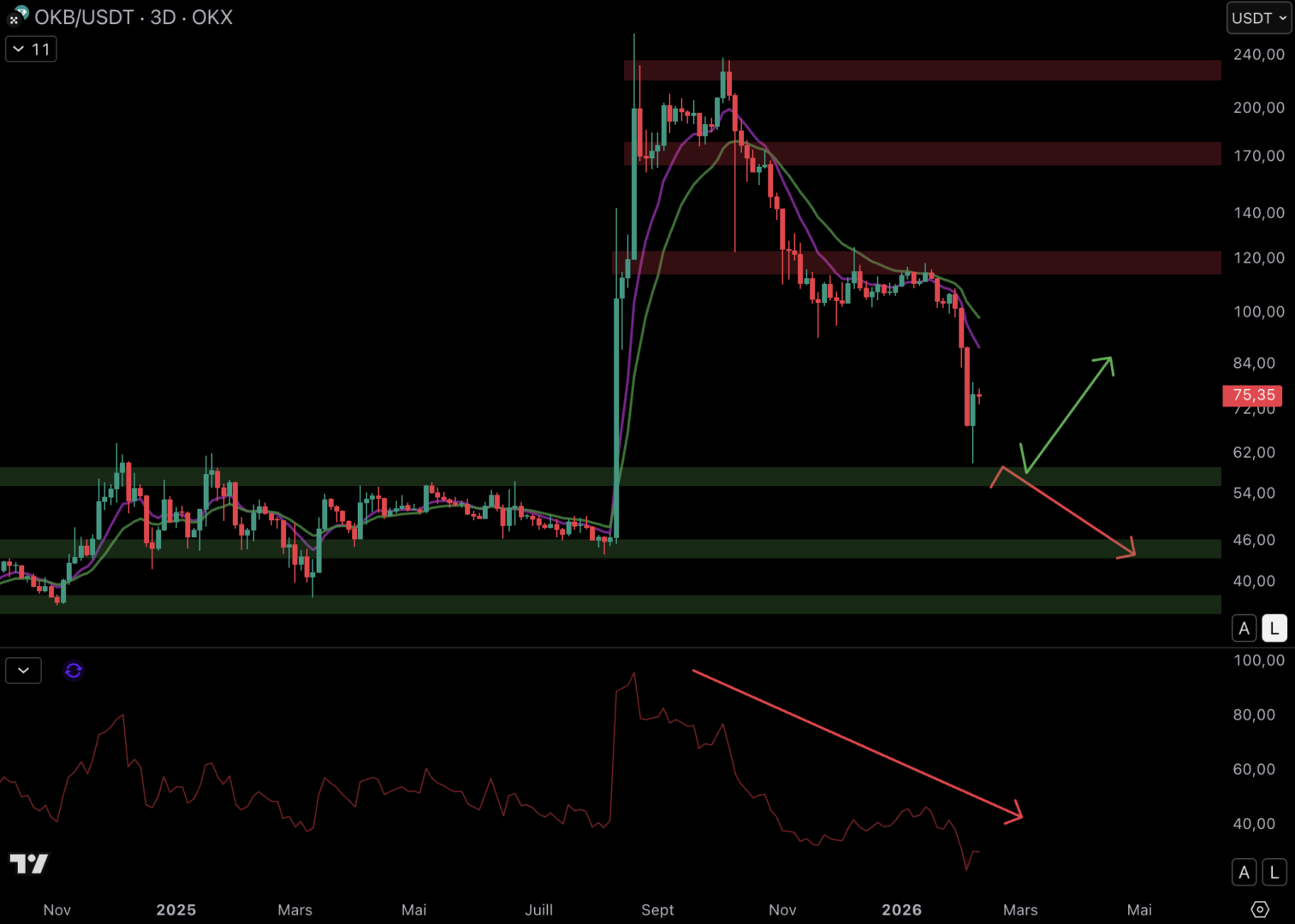 Le RSI est en baisse depuis plusieurs mois sur OKB. Le momentum est donc baissier tant que la dynamique ne change pas sur le RSI.
