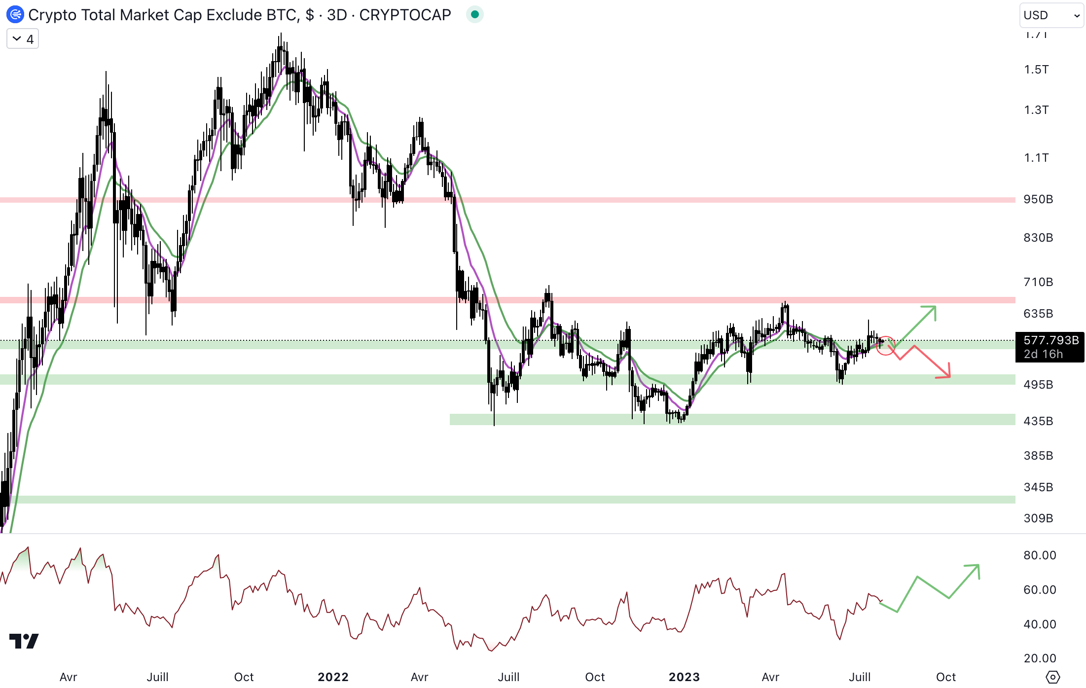 La capitalisation des altcoins a récemment rebondi au niveau du support à 500 milliards de dollars, et a repris le niveau à 570 milliards de dollars. Le cours évolue actuellement au niveau du support à 570 milliards de dollars et au niveau du biais institutionnel (EMA 9/EMA 18) haussier. Les acheteurs doivent défendre ce niveau pour que le cours puisse rebondir :