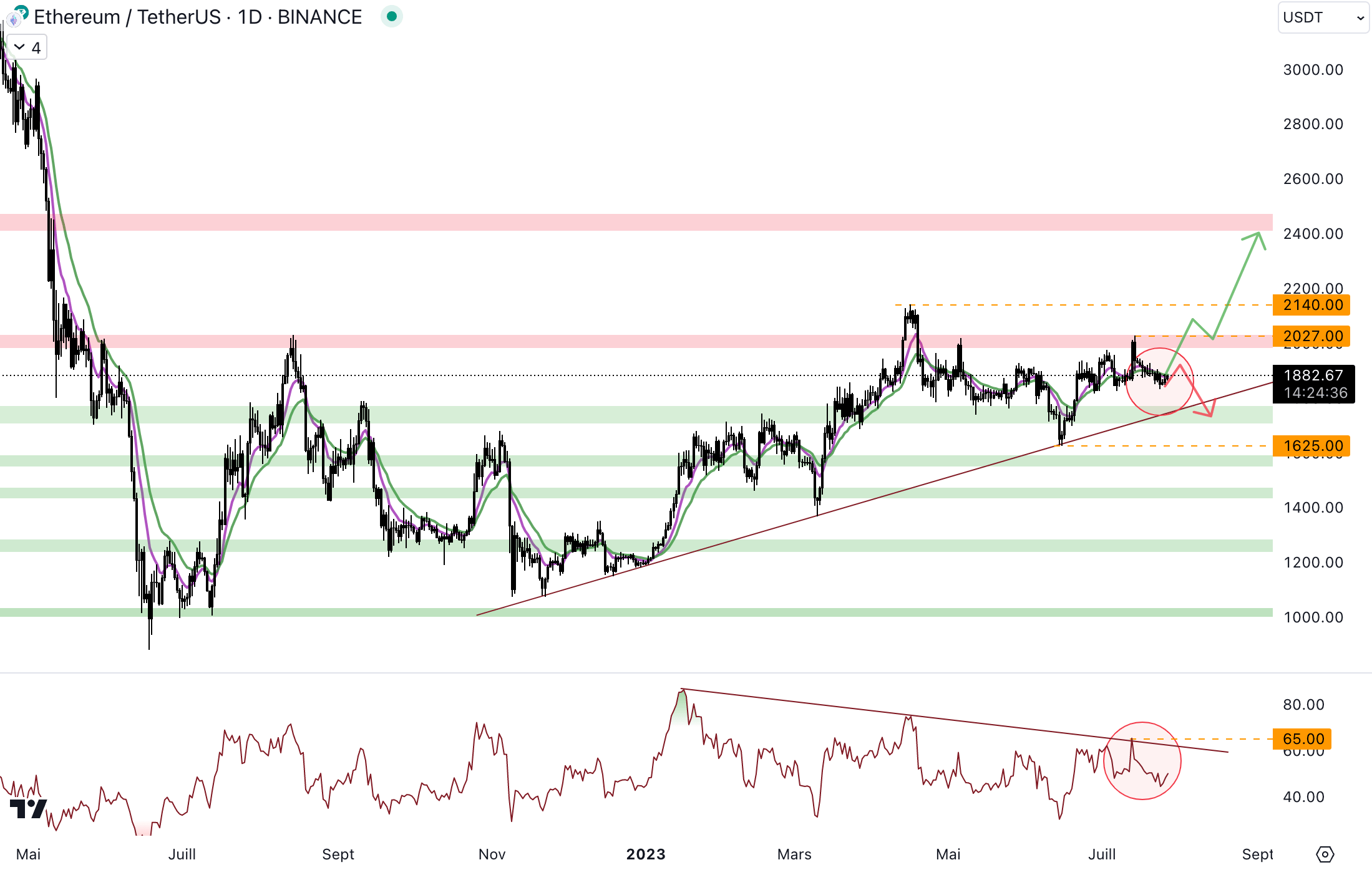 Le RSI continue d’évoluer en dessous de la trendline baissière en journalier. Pour autant, une clôture au-dessus de 65 permettrait à l’indicateur de momentum de casser la trendline baissière, et de retrouver une dynamique avec des creux et des sommets ascendants. Les acheteurs doivent reprendre le momentum pour arriver à enfin casser la résistance à 2 000 dollars.