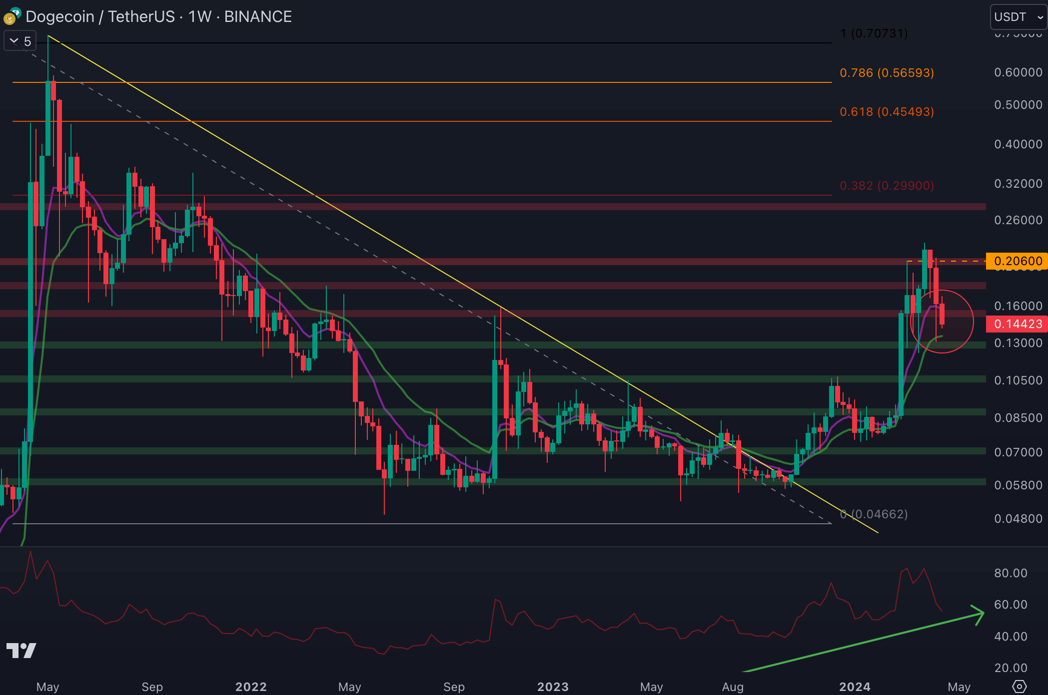 Le Dogecoin (DOGE) corrige, mais la dynamique reste haussière en hebdomadaire