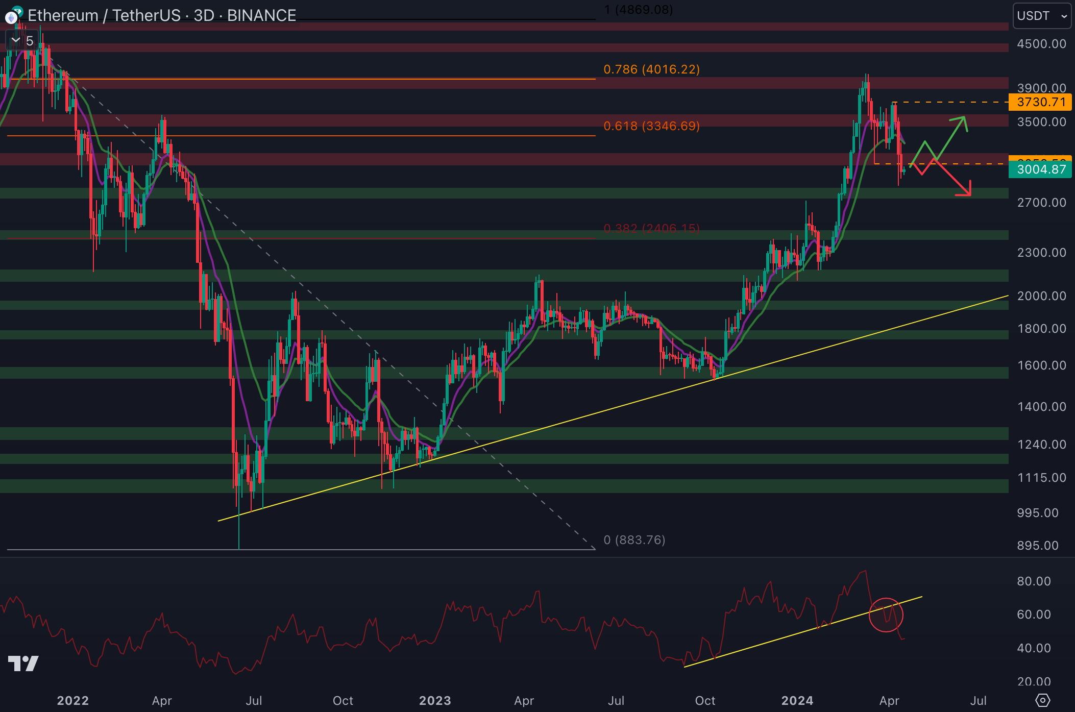 Avec ce mouvement de correction sur le Bitcoin, la dominance est de retour à la hausse. La récente clôture au-delà du dernier sommet montre que les capitaux continuent de se diriger vers le roi des crypto. Il faudra être patient avant de revoir une réelle altseason sur les altcoins. La capitalisation des altcoins affiche désormais une baisse de 30 % depuis le top. Si le support à 950 milliards de dollars cède, un retour à 800 milliards de dollars est possible. De son côté, Ethereum tente de conserver les 3 000 $. Si le niveau à 3 100 $ n’est pas repris, le cours pourrait revenir à hauteur des 2 800 $. ETH est désormais fragile face au dollar et face au Bitcoin. Pour le moment, la paire ETH/BTC continue de se développer en dessous de la trendline baissière mise en place en fin d’année 2022.