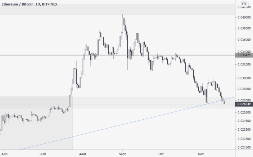 En daily, la tendance à court terme est baissière. Dernièrement, Ethereum ne parvient pas à suivre la cadence imposée par Bitcoin. On surveillera donc attentivement le comportement du prix sur cette zone support, un franchissement à la baisse du support pouvant confirmer une tendance baissière.