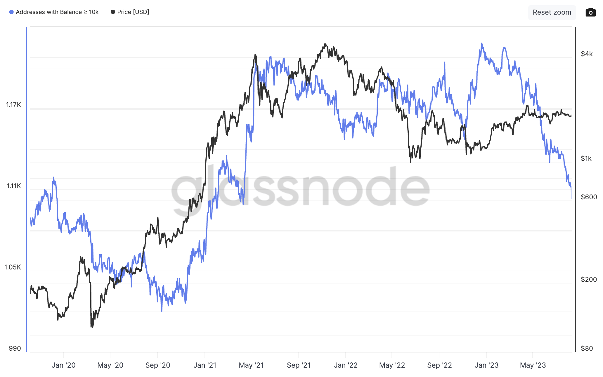 L’analyse on chain permet de comprendre le comportement des opérateurs ayant des portefeuilles importants. Ces adresses sont capables d’avoir un impact réel sur le cours des cryptomonnaies. Ici, on va s’intéresser aux entités ayant plus de 10 000 ETH, aussi appelées whales.