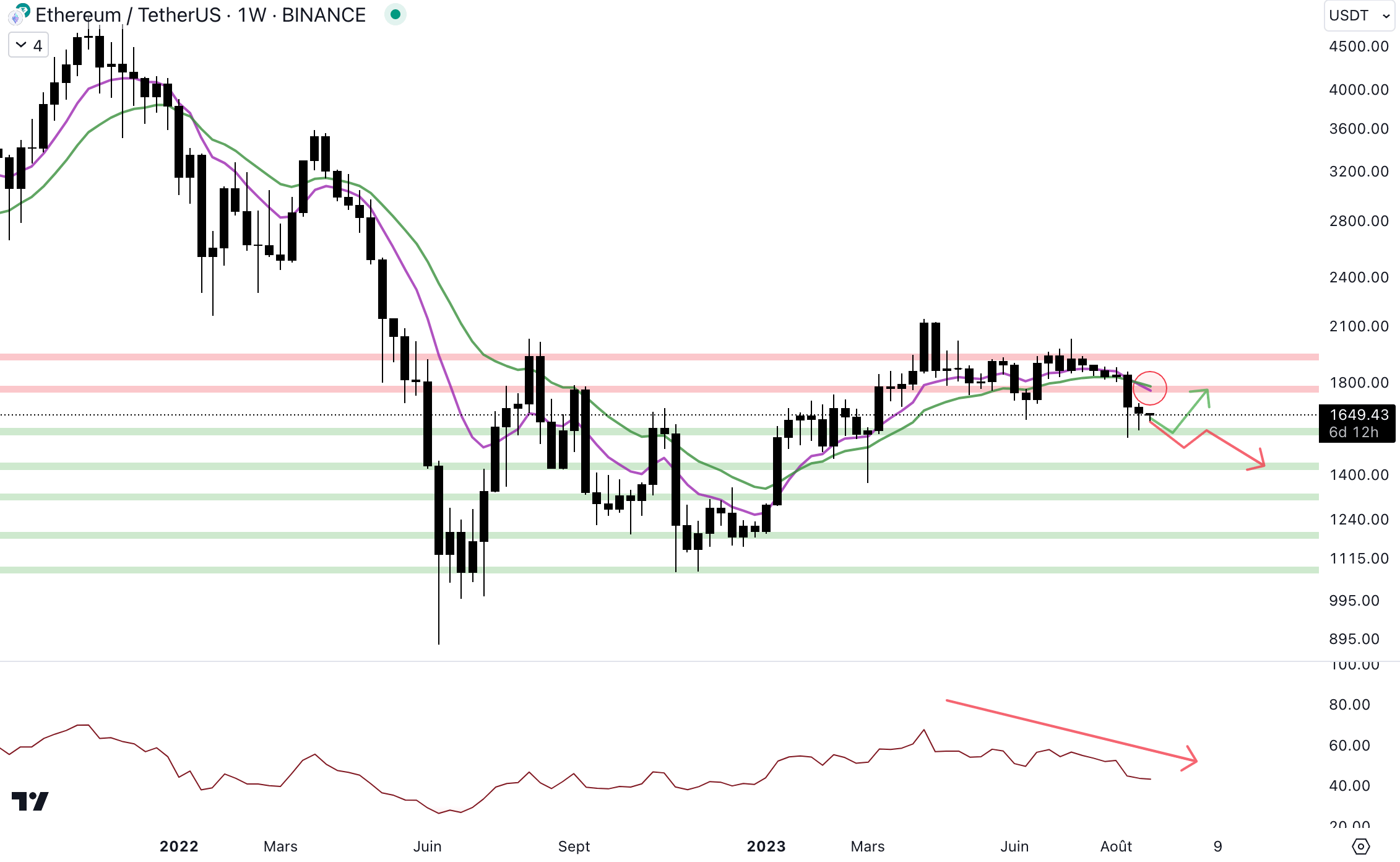 Ethereum voit rouge. Le Bitcoin continue de stagner autour de 26 000 dollars. Les acheteurs doivent rapidement réagir pour éviter une nouvelle vague de baisse sur le roi des cryptomonnaies. Le cours de l’Ether a clôturé la semaine autour de 1 650 dollars. Ainsi, l’ETH clôture une deuxième semaine d’affilée dans le rouge. Les acheteurs et les vendeurs se neutralisent autour de 1 650 dollars, mais un signal baissier semble se dessiner pour le prince des cryptomonnaies en hebdomadaire.