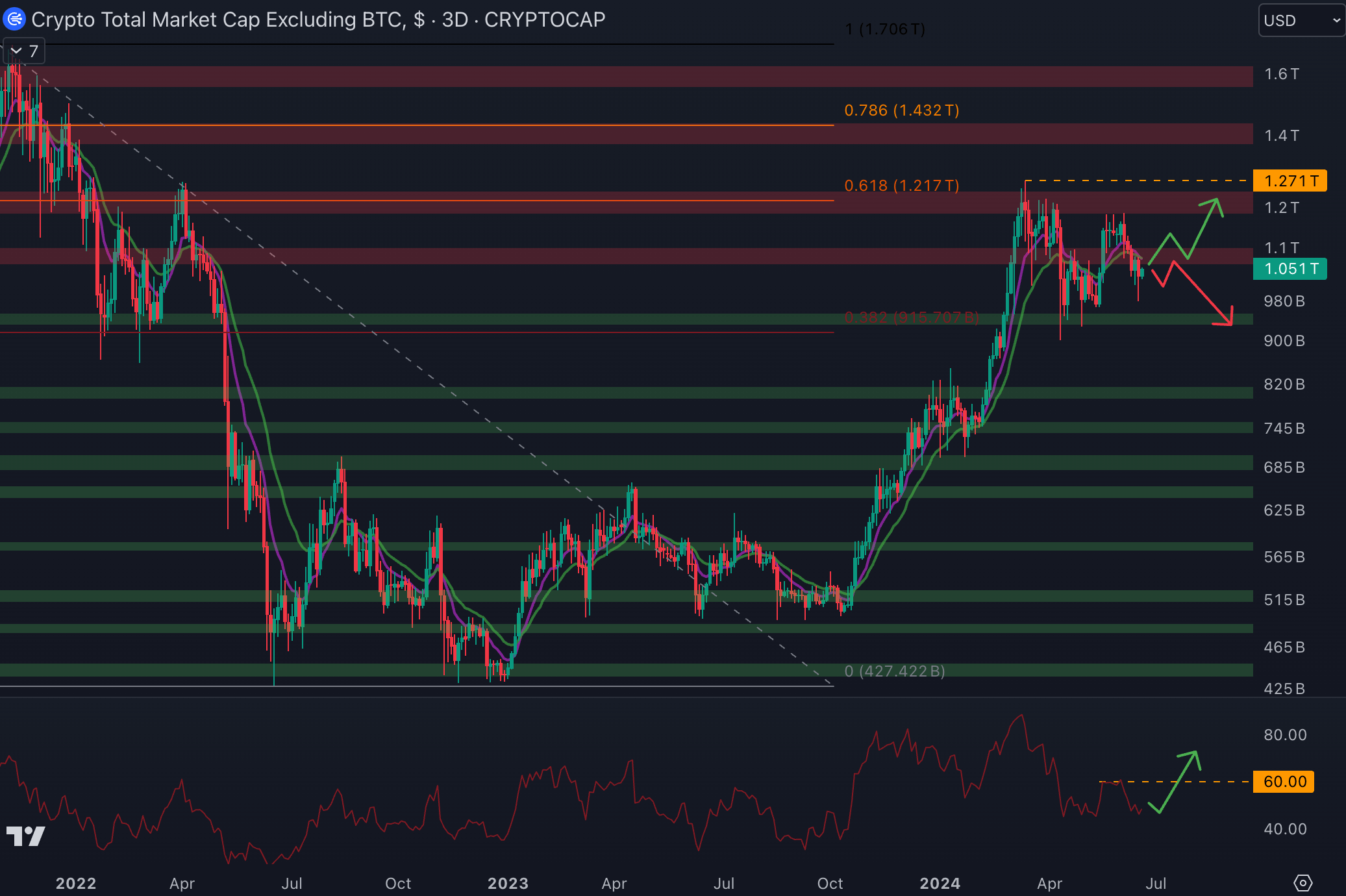 Si la résistance à 1 100 milliards de dollars rejette le cours, la capitalisation des altcoins pourrait connaître une nouvelle chute en direction du support à 950 milliards de dollars. En revanche, si la résistance cède, le cours pourrait revenir une fois de plus au niveau des derniers sommets autour de 1 200 milliards de dollars. Pour continuer sur la dynamique haussière, il faudra une clôture au-delà du dernier sommet marqué à 1 271 milliards de dollars.