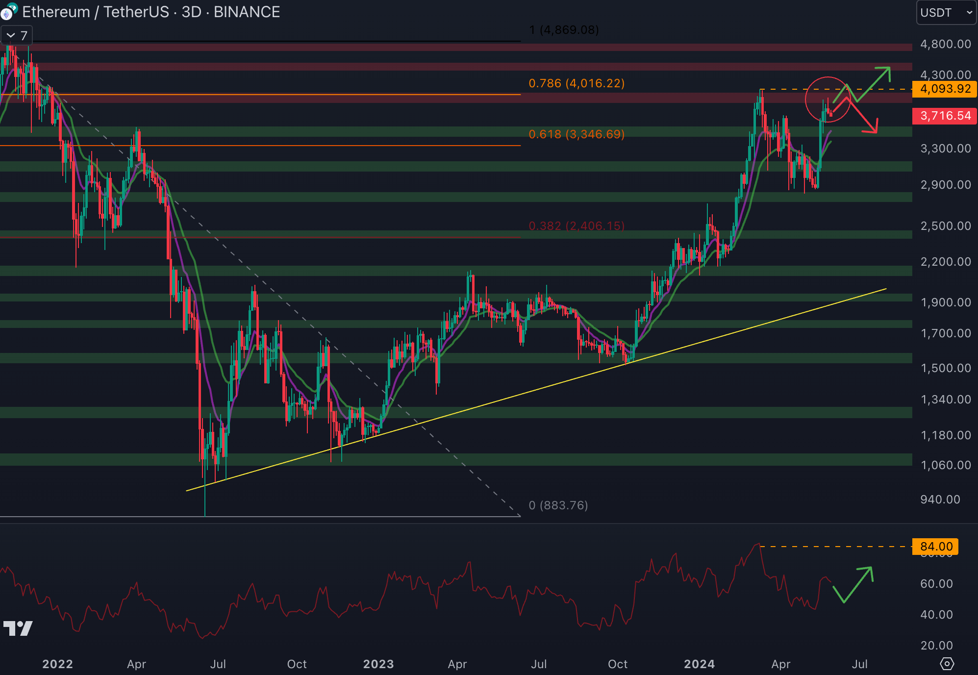 Après la validation des ETF Ethereum au comptant, le cours a explosé à la hausse jusqu’à tomber sur la résistance autour des 4 000 $. Il s’agit d’une résistance non-négligeable, car c’est celle qui a bloqué le cours pendant le mois de mars. Pour le moment, ETH continue d’évoluer au sein d’une tendance haussière. Néanmoins, un rejet plus important pourrait ramener le cours sur le support à 3 500 $. Le biais institutionnel (EMA 9/EMA 18) haussier se trouve à ce niveau-là :