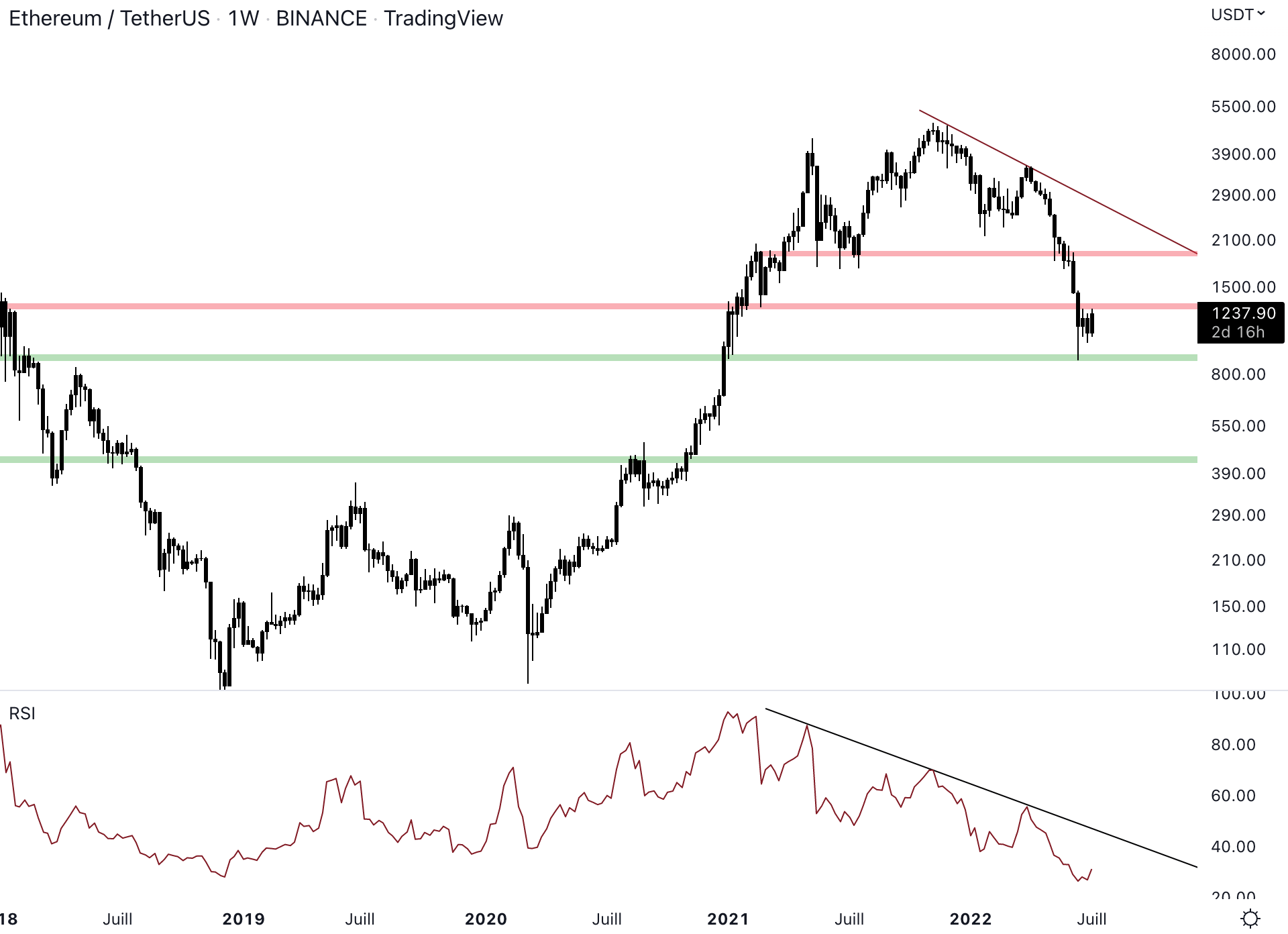 Ça passe, ou ça casse …– Après un déploiement réussi de The Merge sur Sepolia, il ne reste plus que quelques étapes cruciales avant la fin de la mise à jour d’Ethereum. Pourtant, en l’espace de quelques semaines, tous les espoirs des acheteurs ont été annihilés par une puissante force vendeuse. Le mois de juin a été particulièrement compliqué pour la blockchain de Vitalik Buterin qui a perdu 45 %. Ceux qui croient dur comme fer au projet continuent d’accumuler en cette période compliquée. Ethereum tente en ce moment même un changement de tendance, mais les bulls vont-ils enfin réussir à briser la force vendeuse qui est en place depuis début avril ? Analysons la seconde capitalisation du marché des cryptomonnaies.