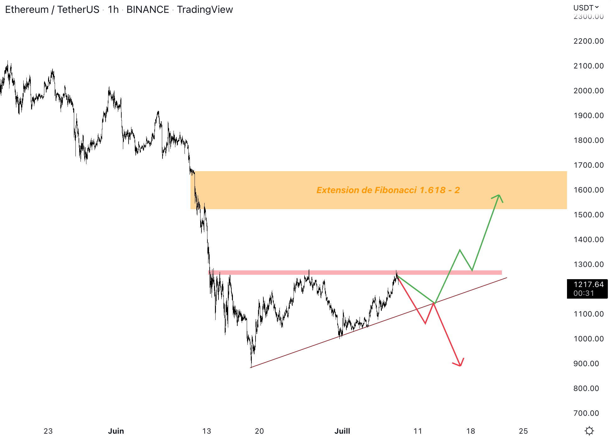 En 1H, Ethereum bloque à 1 250 $. Les ours arrivent à repousser les prix. Cependant, plus une résistance est touchée, plus les probabilités pour qu’elle cède sont élevées. Il y a donc deux possibilités à court terme :