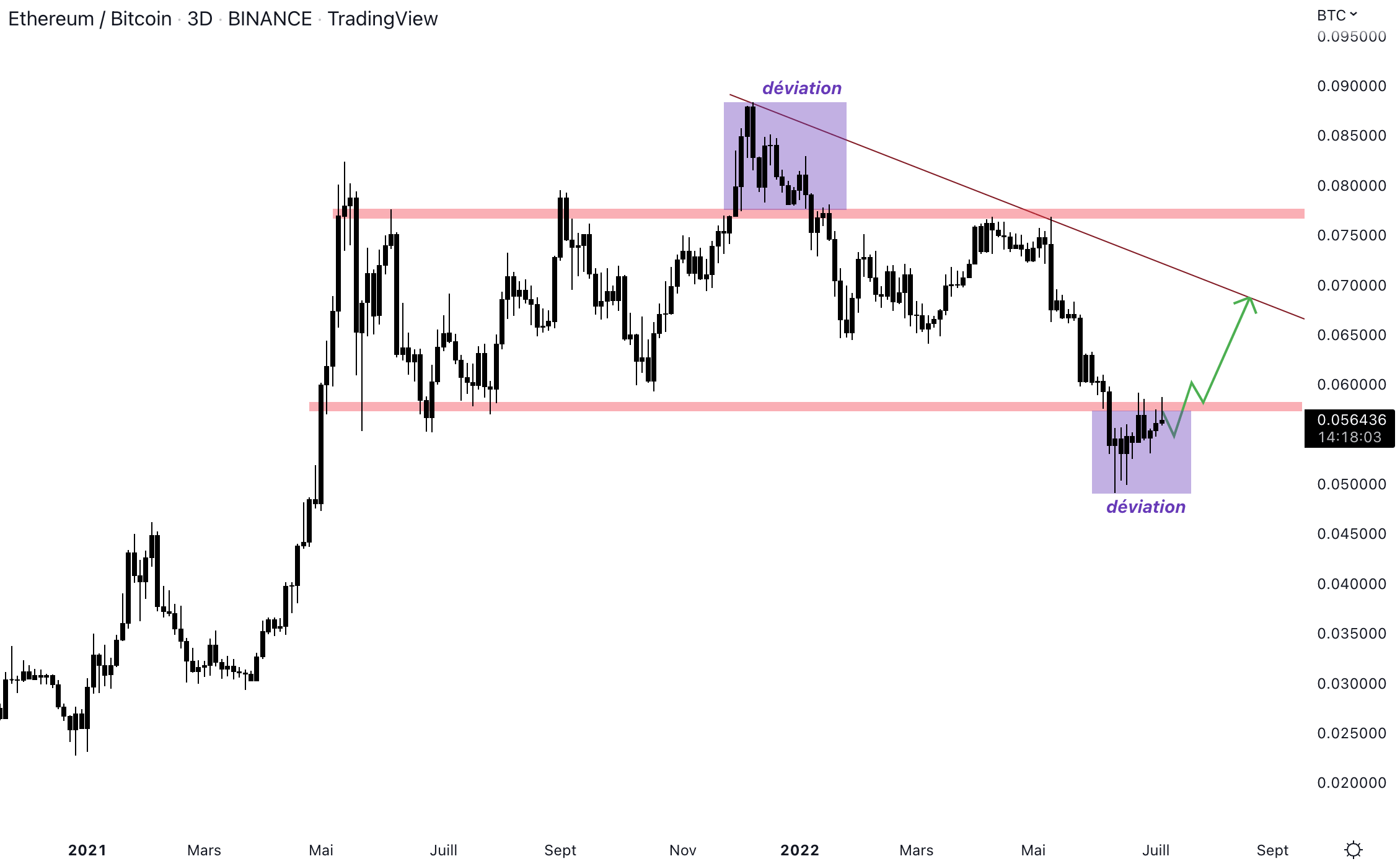 Si le cours d’Ethereum contre Bitcoin arrive à dépasser la résistance en unité de temps trois jours et hebdomadaire, cela montrerait que le cours est dans un range depuis mai 2021. Ce scénario est un scénario optimiste. En effet, les altcoins pourraient en profiter pour performer pendant l’été, une période propice pour les altcoins vu les faibles volumes durant cette période.