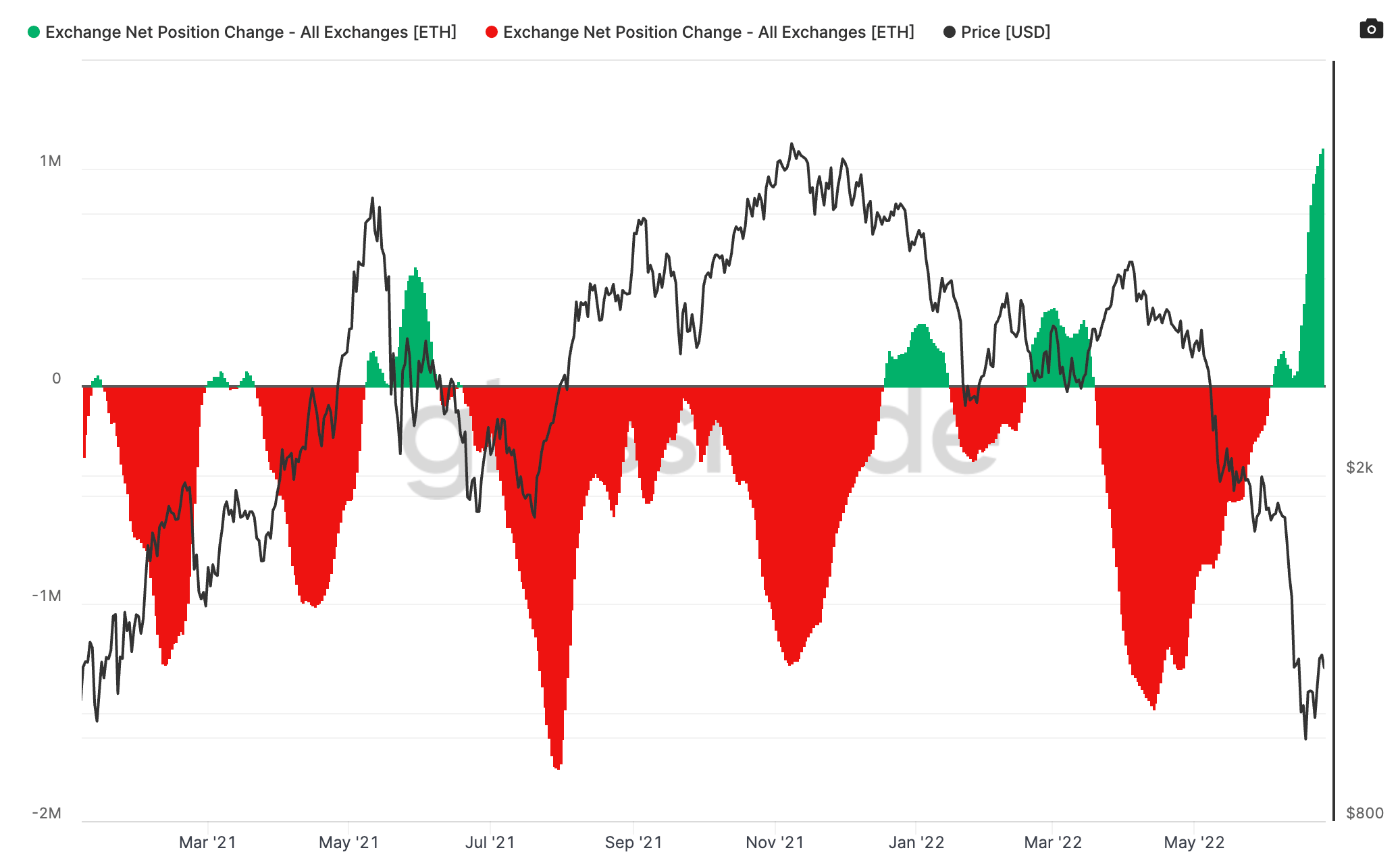 L’analyse on-chain permet de connaître le comportement des acteurs. Récemment, des quantités non-négligeables d’ethereum ont été déposées sur les exchanges :
