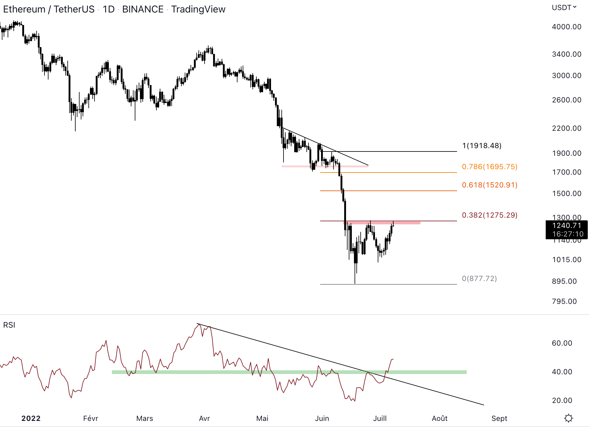 Ethereum est en tendance baissière en hebdomadaire. En journalier, le cours tente de changer de dynamique en dépassant la résistance à 1 250 $ :