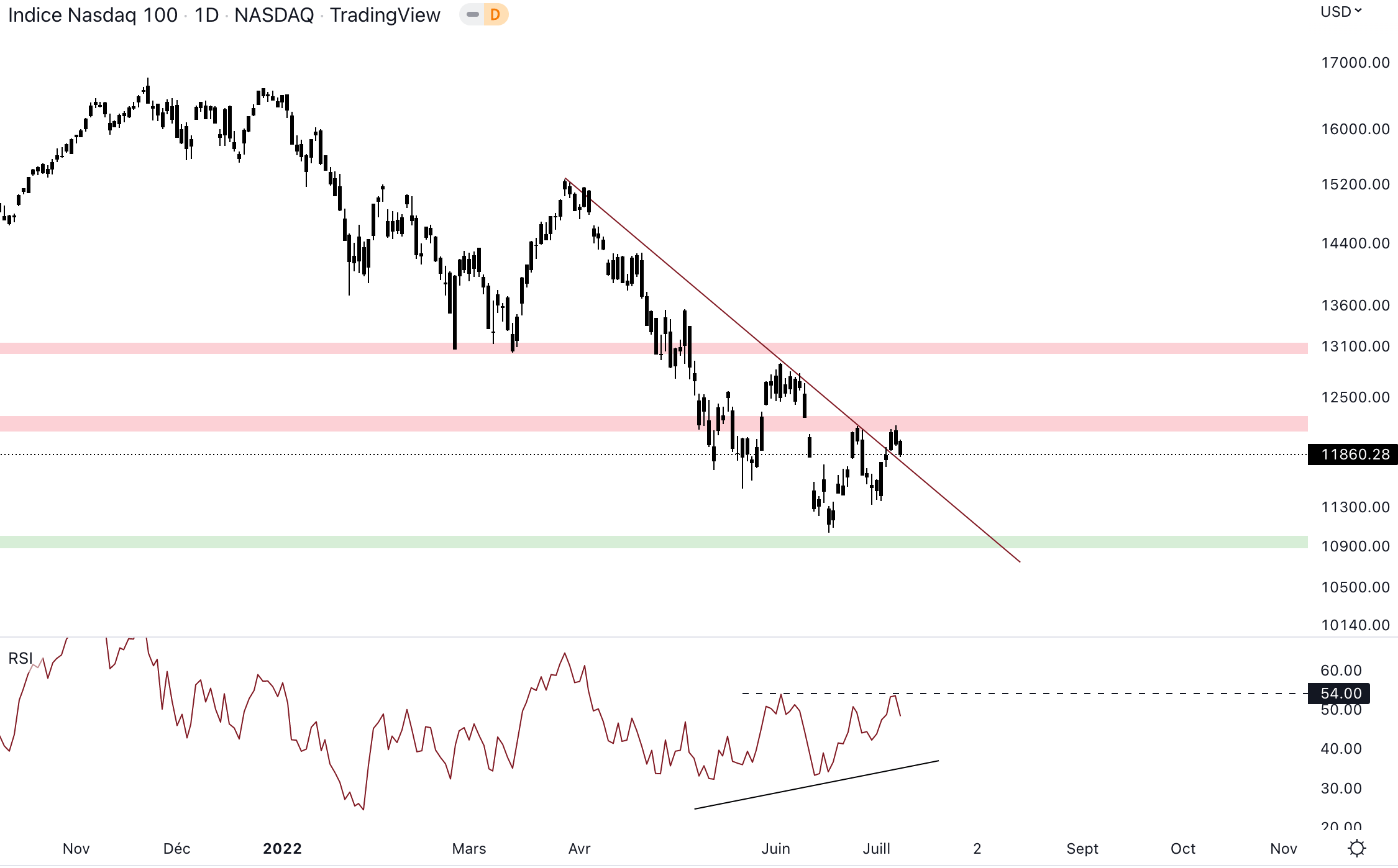 Le NASDAQ est dans la même situation que le S&P 500, il bloque au niveau de la résistance à 12 200 $. Il montre cependant plus de résilience que son homologue :