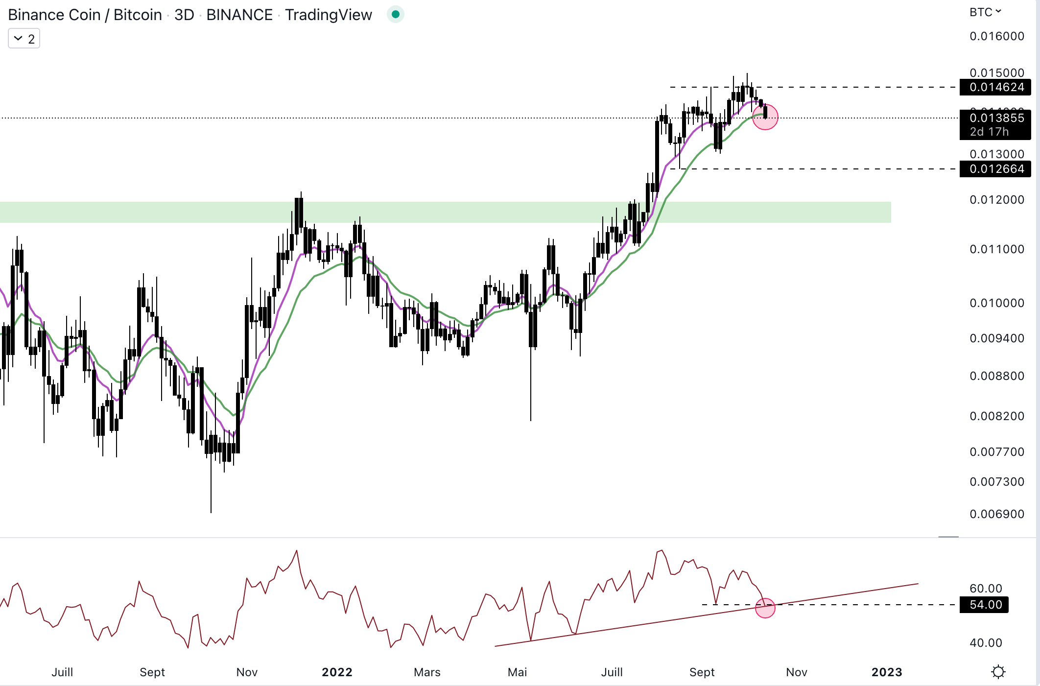 Face au Bitcoin, le BNB pourrait rapidement rebondir, car le cours se situe au niveau du biais institutionnel et celui-ci pourrait faire office de support.