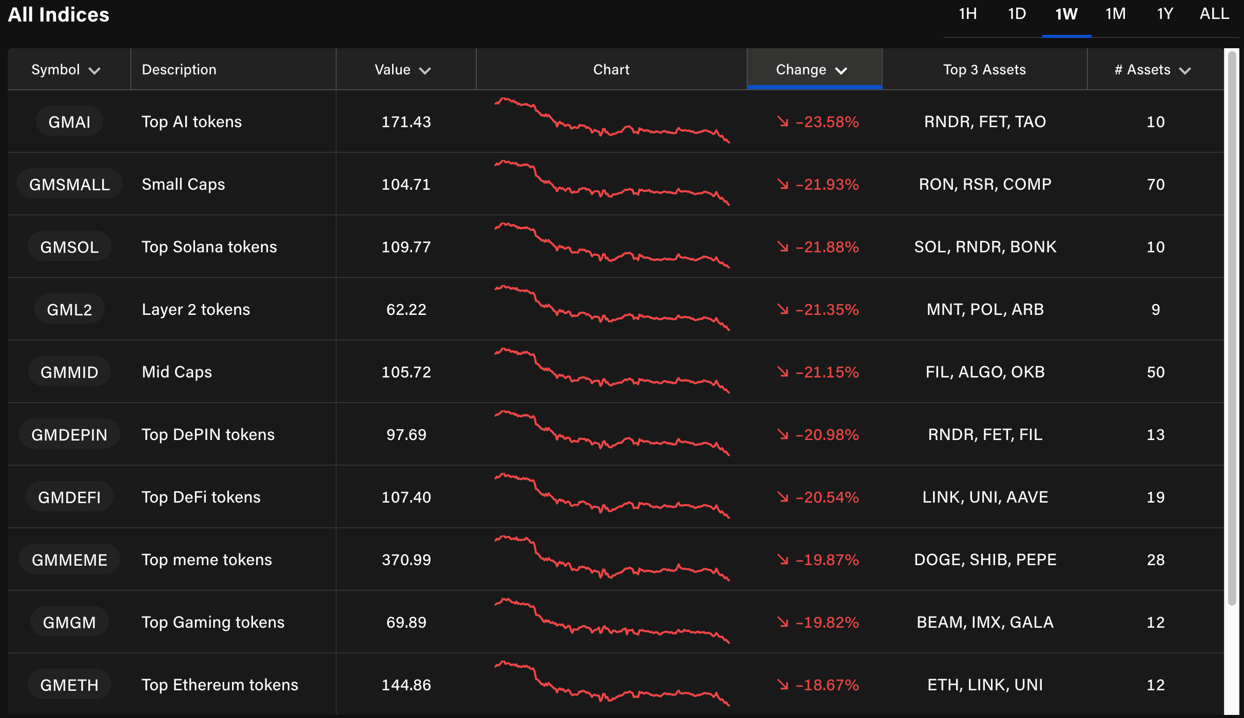 La capitalisation des altcoins est en train de corriger, mais la dynamique globale reste haussière pour le moment. Pour autant, pour pouvoir repartir à la hausse, il faudra arriver à casser les résistances à 1 400 milliards de dollars et à 1 600 milliards de dollars. Rien de catastrophique donc pour les altcoins, mais ils n’affichent toujours pas de performances de bull market. D’ailleurs, tous les secteurs saignent sur la dernière semaine, notamment celui de l’intelligence artificielle (IA).