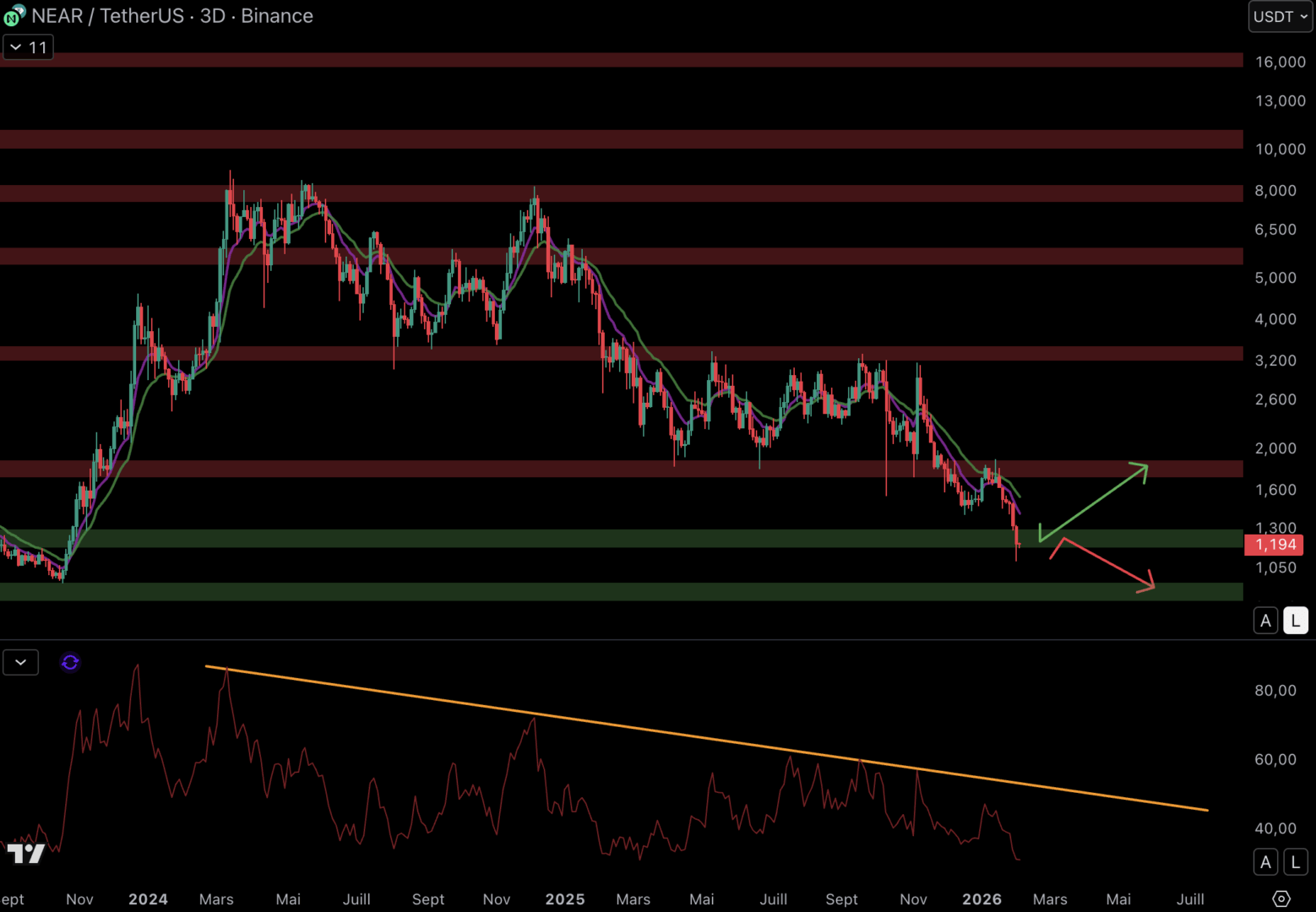 Une réaction acheteuse est possible sur le support à 1,2 $. Si le cours rebondit, il pourrait grimper vers la résistance à 1,8 $. Mais si les vendeurs conservent la main et que le support ne tient pas, NEAR pourrait chuter vers le niveau à 0,95 $. De son côté, le RSI est fragile depuis plusieurs mois. Le momentum est donc également dans les mains des vendeurs.
