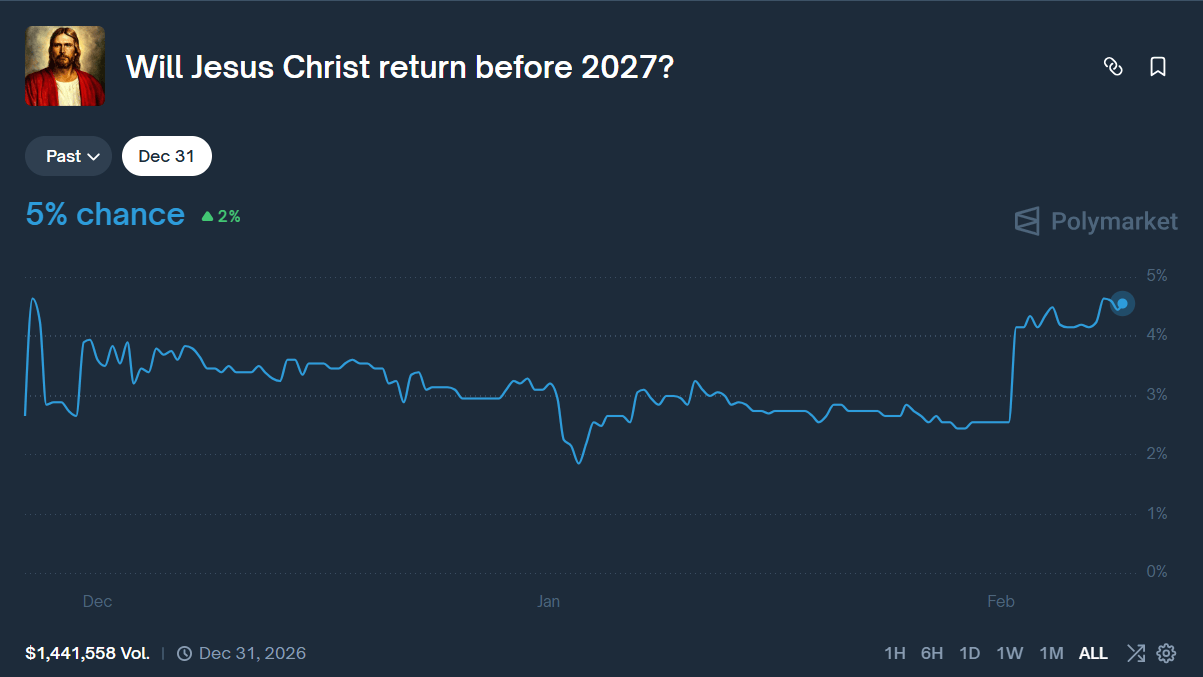 - Un pari insolite sur Polymarket a propulsé les chances d’un retour de Jésus-Christ avant fin 2026 à 5 %, un chiffre qui a doublé depuis janvier.