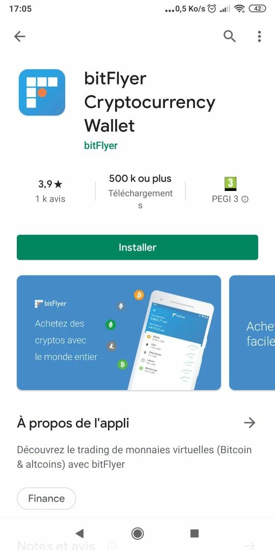 Pour en profiter, il vous suffit de vous rendre sur le Google Play Store (capture d’écran ci-contre) ou sur l’Apple Store, pour télécharger l’application. Si vous avez déjà un compte chez bitFlyer, il vous suffira alors simplement de vous connecter avec votre email et votre mot de passe utilisés lors de votre création de compte initiale.