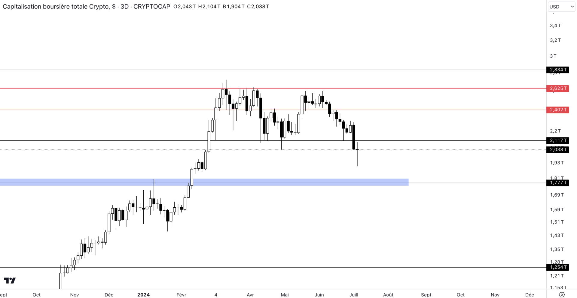 Dans sa globalité, si le marché vient à opérer un échec sur la borne basse actuelle, il prendra progressivement le chemin des 1 770 milliards de dollars que nous avions eu l’occasion d’évoquer auparavant. Quoi qu’il arrive, si le marché vient à reprendre le chemin de la zone pivot représentée en bleu, l’enjeu repose dans la capacité du marché à ne pas chuter sous cette zone, ce qui permettra d’éviter un retour en direction des 1 254 milliards de dollars.