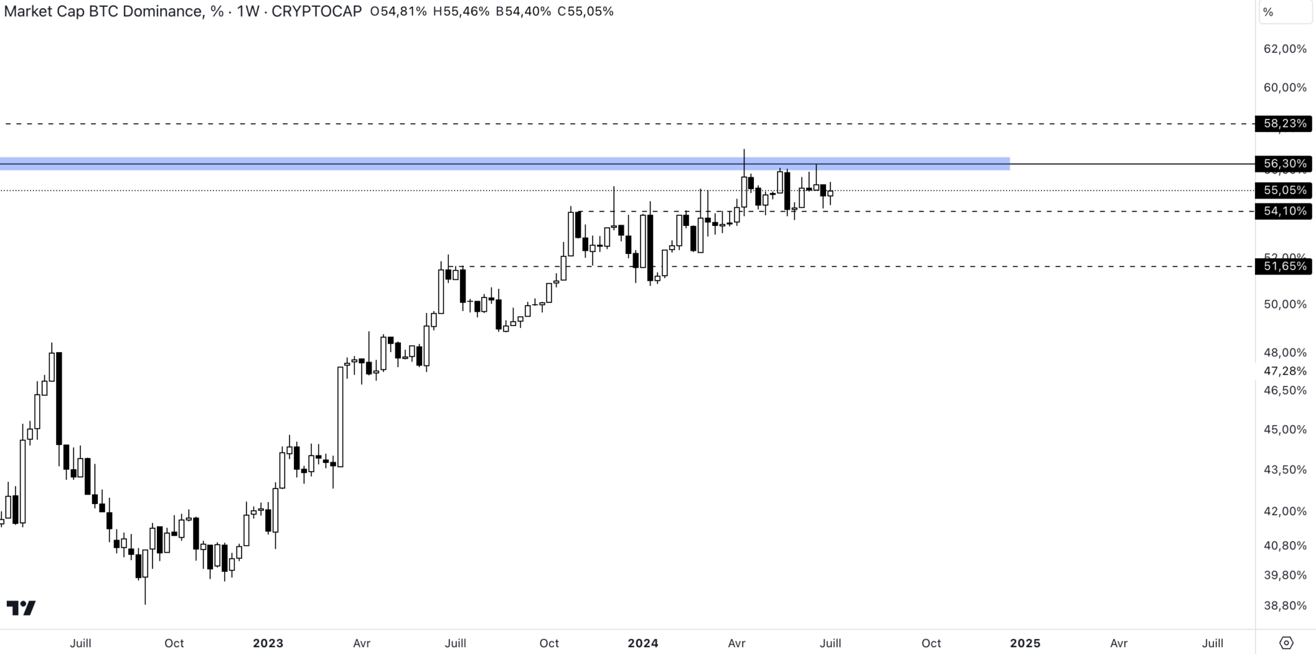 Concernant le roi des cryptomonnaies, face à nos précédents points crypto du week-end, il y a eu peu d’évolutions. Le cours évolue depuis plusieurs semaines entre les 54,10 % et les 56,30 % de dominance, ce qui lui permet d’avoir une dynamique particulièrement stable. Durant les prochaines, à quoi faut-il s’attendre sur la dominance du roi des cryptomonnaies ? En pleine latéralisation, l’objectif réside dans sa capacité à franchir la zone pivot se situant à 56,30 % de dominance.