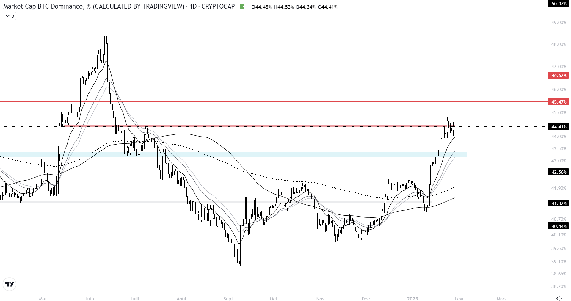 Cependant, après un beau mouvement qui a pris forme durant le début d’année, il convient d’être prudent et ne pas oublier que le marché se situe sous résistance. Ceci vous amène, en cas de prise de position, de diminuer votre risque, que ce soit en termes de capital ou avec l’utilisation d’effets de levier. Le second objectif, outre la cassure haussière de la confluence technique, concerne le support qui existait de juin à octobre 2022. Les altcoins doivent impérativement se maintenir au-dessus s’ils ne souhaitent pas s’inscrire dans une nouvelle dynamique baissière.