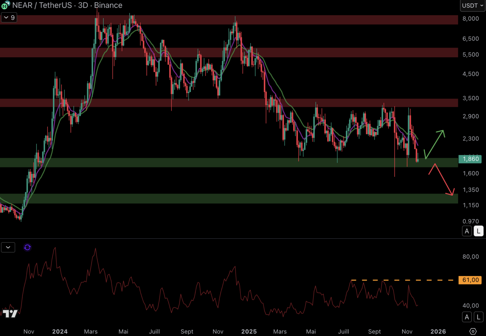RENDER a connu une période haussière entre 2022 et 2024, mais depuis le début de l’année 2024, ce sont les vendeurs qui contrôlent le cours. Le cours affiche une chute de près de 90 % depuis le sommet de 2024. Les structures sont toujours baissières, et le cours se fait rejeter entre les moyennes mobiles (EMA 9/EMA 18) baissières depuis plusieurs mois :
