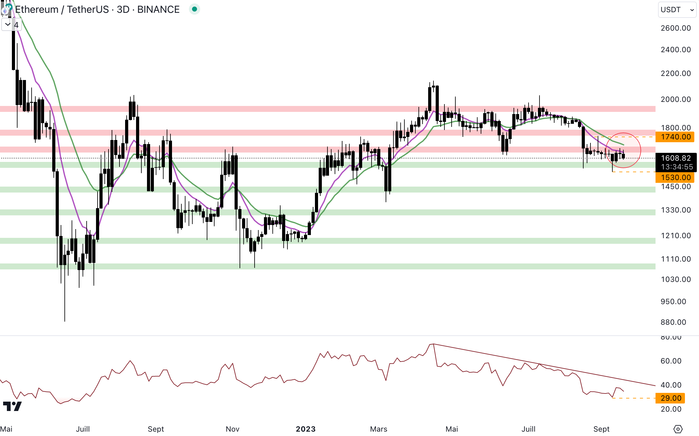 ETH a rebondi au niveau du support à 1 570 $, mais le cours a du mal à dépasser la résistance à 1 650 $. Il s’agit également du niveau où se trouvent les moyennes mobiles 9 et 18 orientées à la baisse. Finalement, le cours est enfermé entre ces deux niveaux depuis environ un mois :