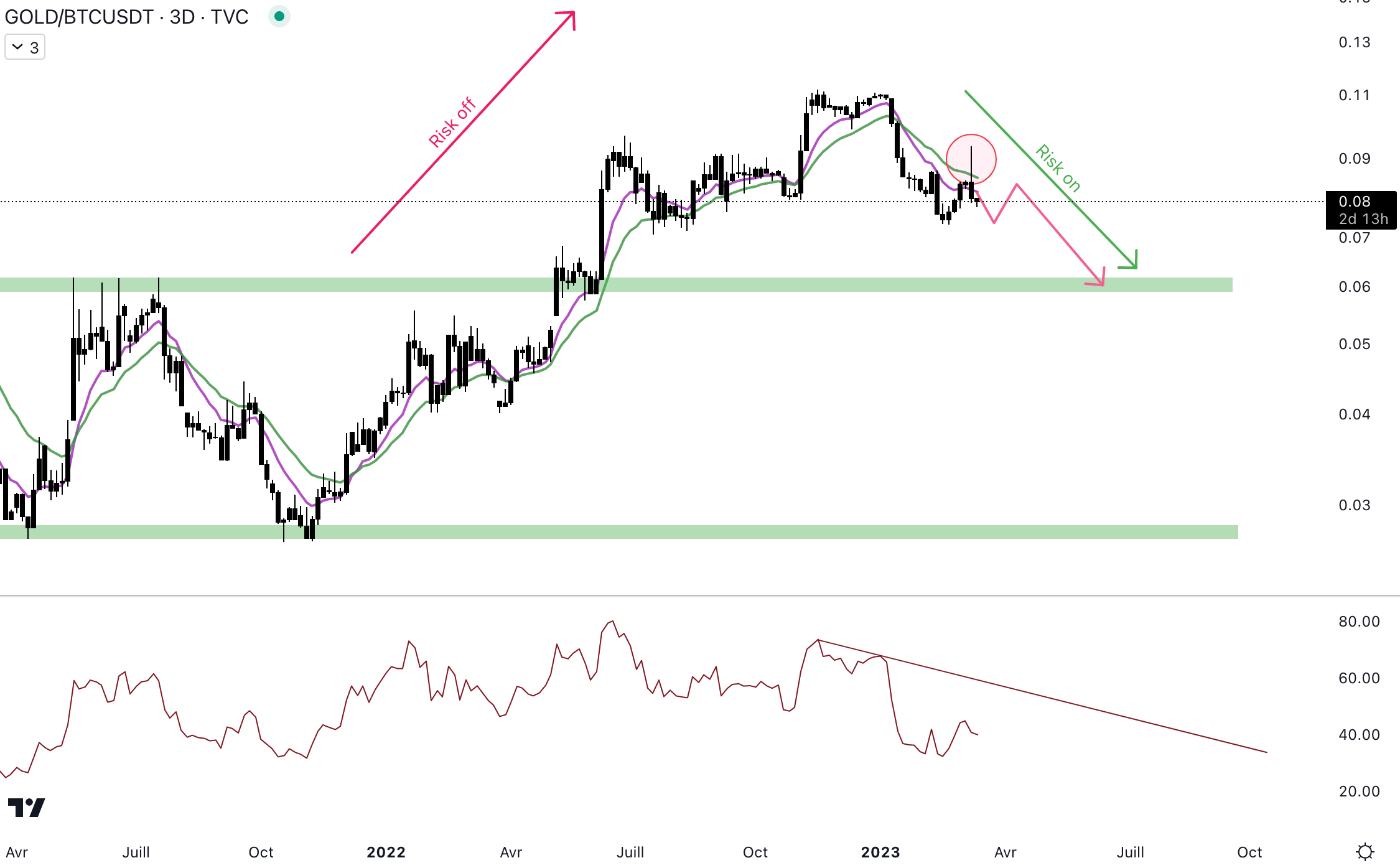 Le RSI est en train de se contracter depuis plus d’un an. La résolution de la contraction pourrait amener beaucoup de volatilité sur les marchés financiers. Dans les semaines à venir, le RSI pourrait rejoindre la trendline haussière. Un rebond pourrait alors apparaître.