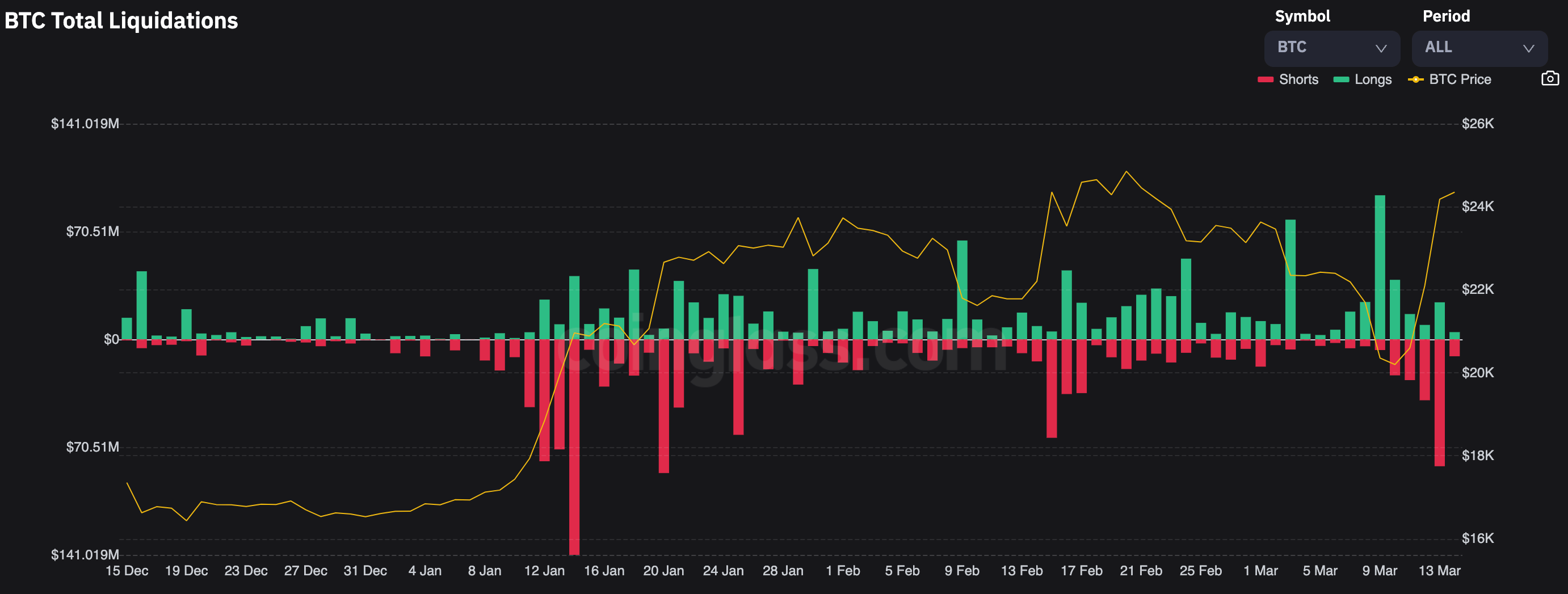 Le 9 mars, le marché a connu la plus grosse journée de liquidation d’achats sur le Bitcoin depuis décembre 2022. Quelques jours plus tard, le marché décide de liquider les shorts. Au final, 83 millions de dollars ont été liquidés, le 13 mars 2022. C’est un montant important, mais cela reste inférieur à la journée du 14 janvier avec 140 millions de dollars de liquidé côté vendeurs.