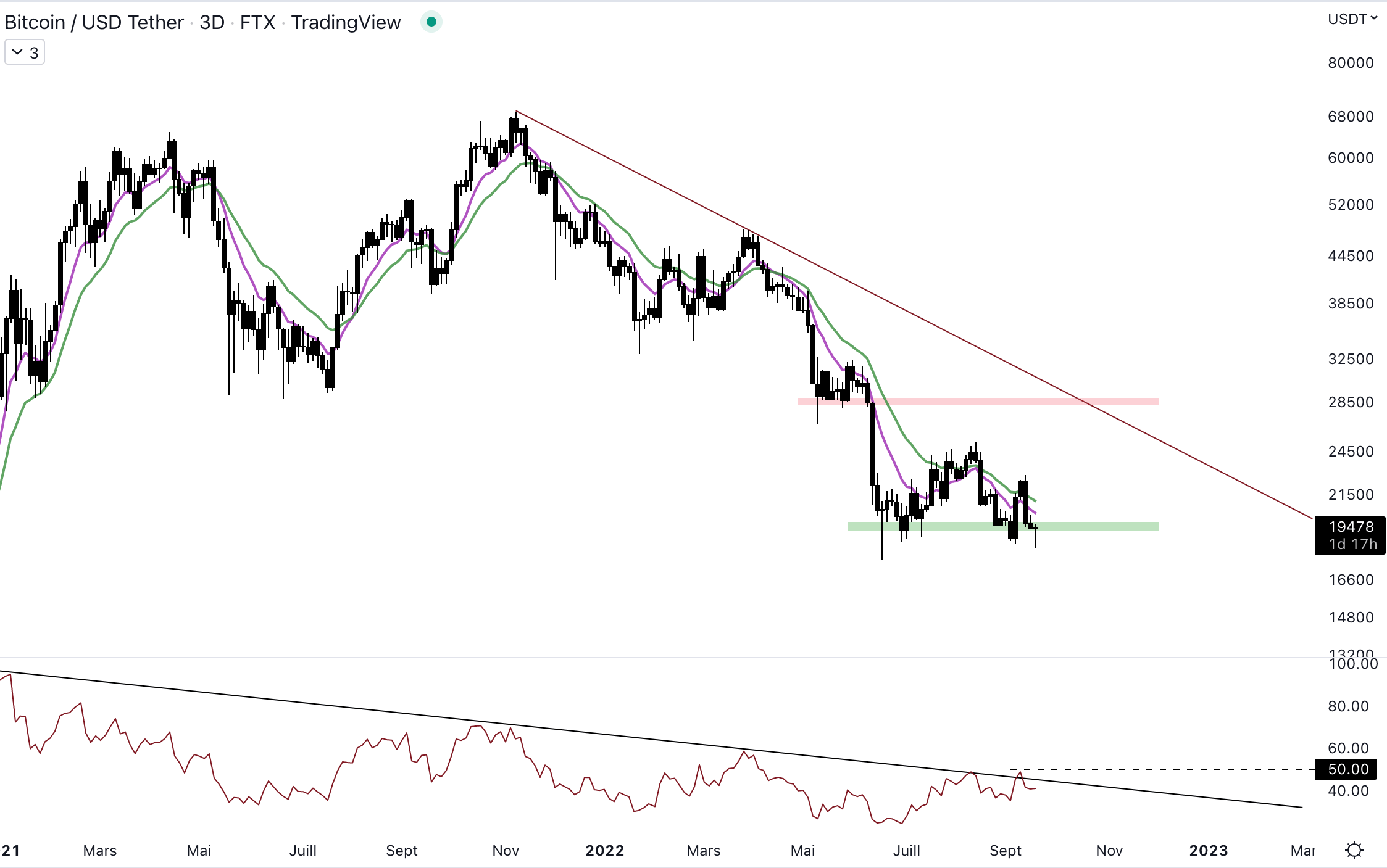Le momentum est toujours fébrile, le RSI n’arrive pas à sortir de la trendline baissière. Cependant, une divergence haussière pourrait se mettre en place en cas de clôture au-dessus de 50 de RSI. Ceci montrerait un affaiblissement de la force vendeuse et permettrait au cours de revenir – à minima – proche de la résistance à 24 500 $.