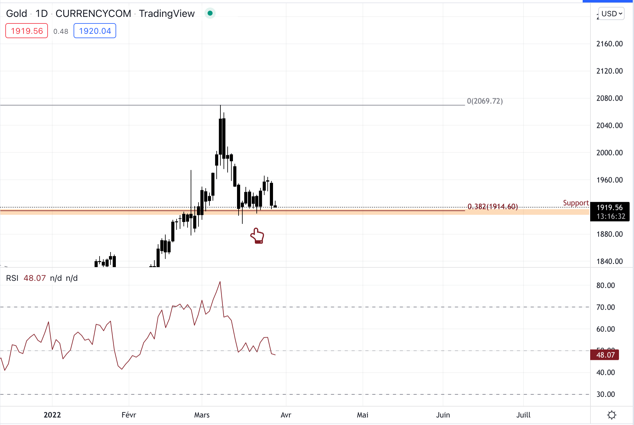 D’un point de vue momentum, le RSI montre un peu de faiblesse et il se pourrait que l’or oscille entre 1 900 $ et 1 950 $ pendant quelque temps, au moins le temps de retrouver un momentum haussier.