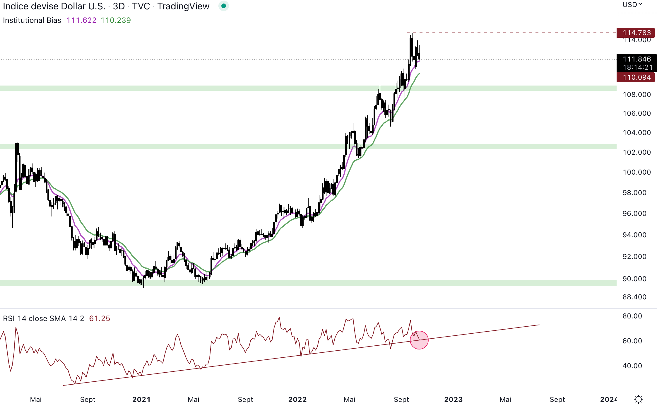 Le dollar est l’actif refuge de l’année 2022. Les actifs risqués comme le Bitcoin et les cryptomonnaies en général ont du mal à performer depuis que le dollar attire les capitaux. Un top local sur le dollar permettrait probablement un peu de respiration côté cryptomonnaies :