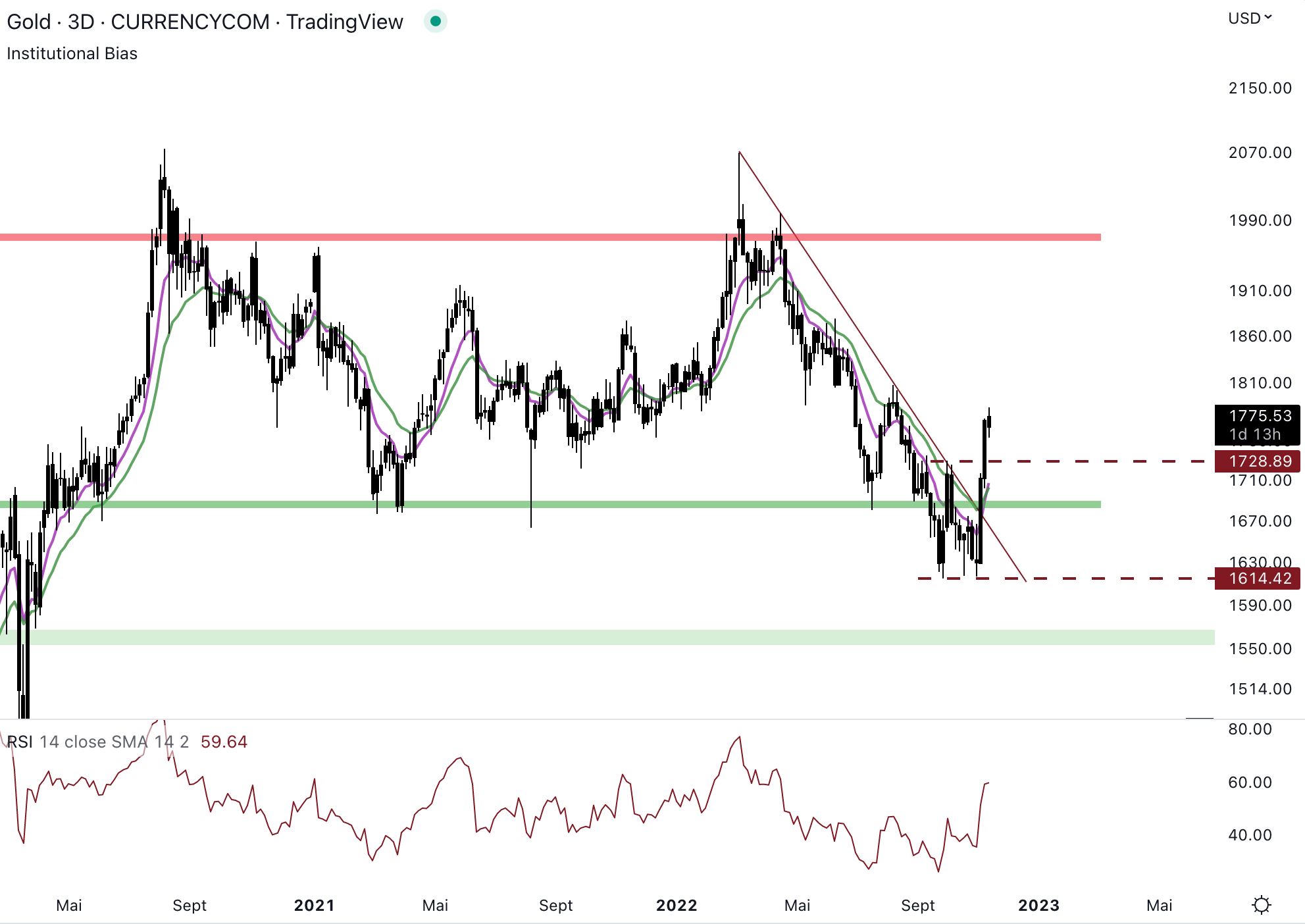 L’or était bloqué sous le support hebdomadaire, mais les acheteurs ont réussi à reprendre le contrôle du cours :