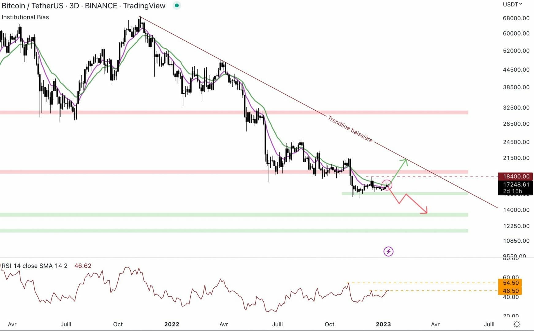 Dès lors, on remarque que la volatilité est extrêmement basse actuellement et qu’elle se trouve au niveau du support. Le cycle de baisse de la volatilité est probablement terminé. Un cycle de hausse pourrait alors se mettre en place. 2023 pourrait être une année volatile. On peut donc imaginer que la volatilité puisse rejoindre la borne haute. Cependant, cela ne donne aucune information sur l’orientation du cours du Bitcoin et des cryptomonnaies en général.
