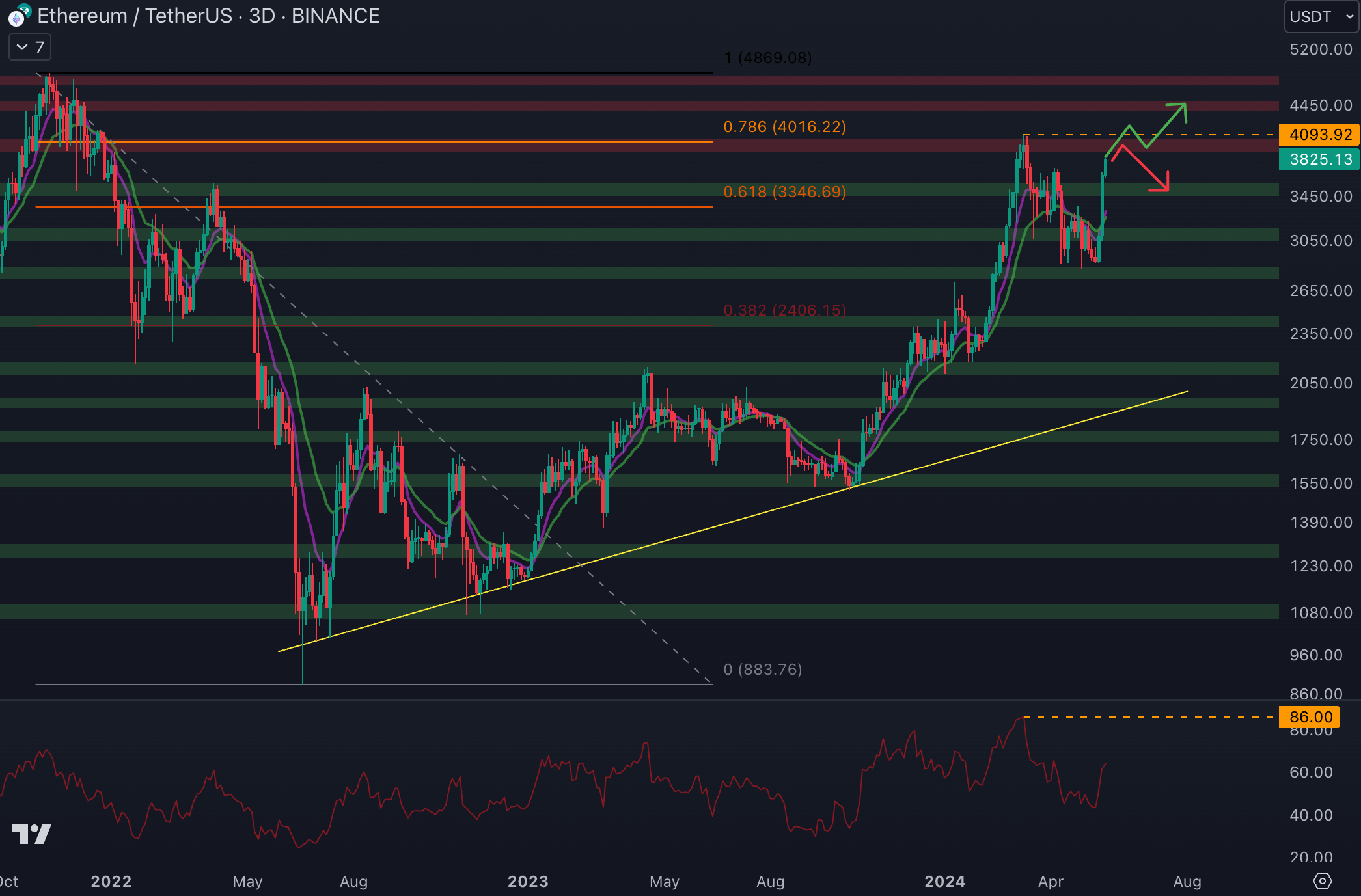 En cas de rejet, le cours d’ETH pourrait rejoindre le support à 3 500 $. En revanche, une cassure de la résistance à 4 000 $ permettrait au cours de marquer un nouveau plus haut en 2024. Une structure haussière en zone de rechargement de shorts serait extrêmement positive, et le cours aurait de grandes chances de retrouver le dernier ATH de 2021.